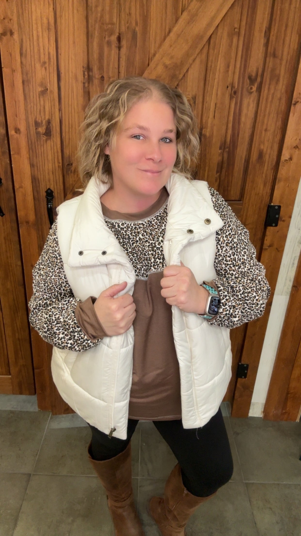 Adorable two tone brown leopard top. Pairs perfect with our oversized vest! I am L/XL in sizing and this is a XL I am wearing is the perfect fit especially for leggings!