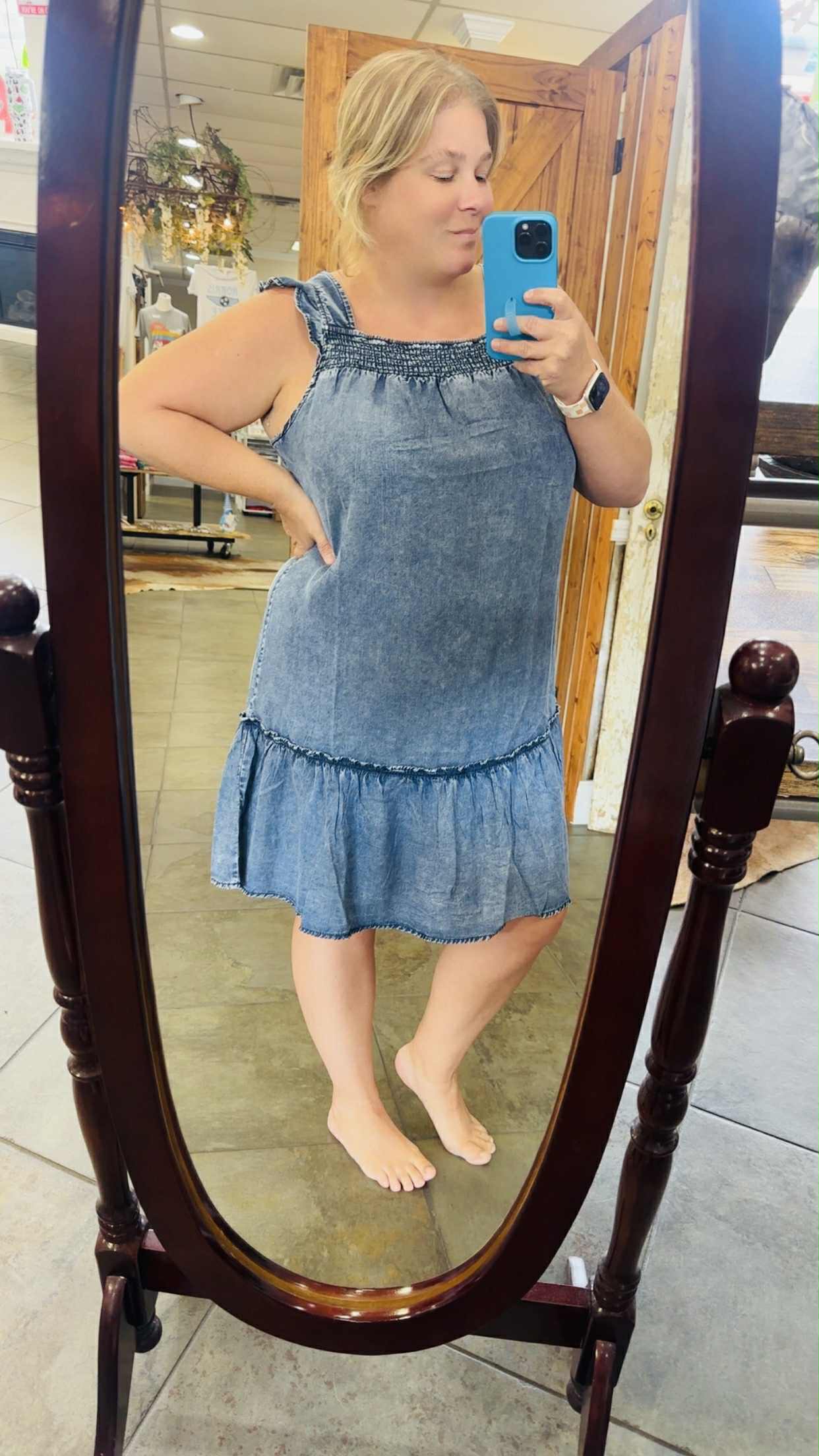 Denim Smocked Mini Dress with Ruffle
