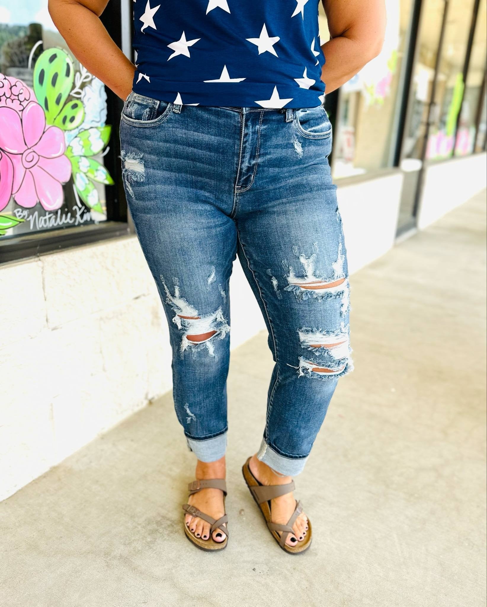 Model is wearing size 13 this is her average for Judy Blue.. Boyfriend fit are sometimes more relaxed fit