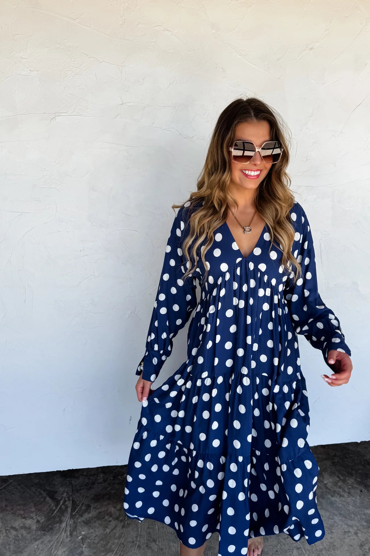 This tiered polka dot midi dress is features a v-neckline, long balloon sleeves with button cuffs, and flowy tiers for movement. Available in navy and rust, both perfect for summer into fall.