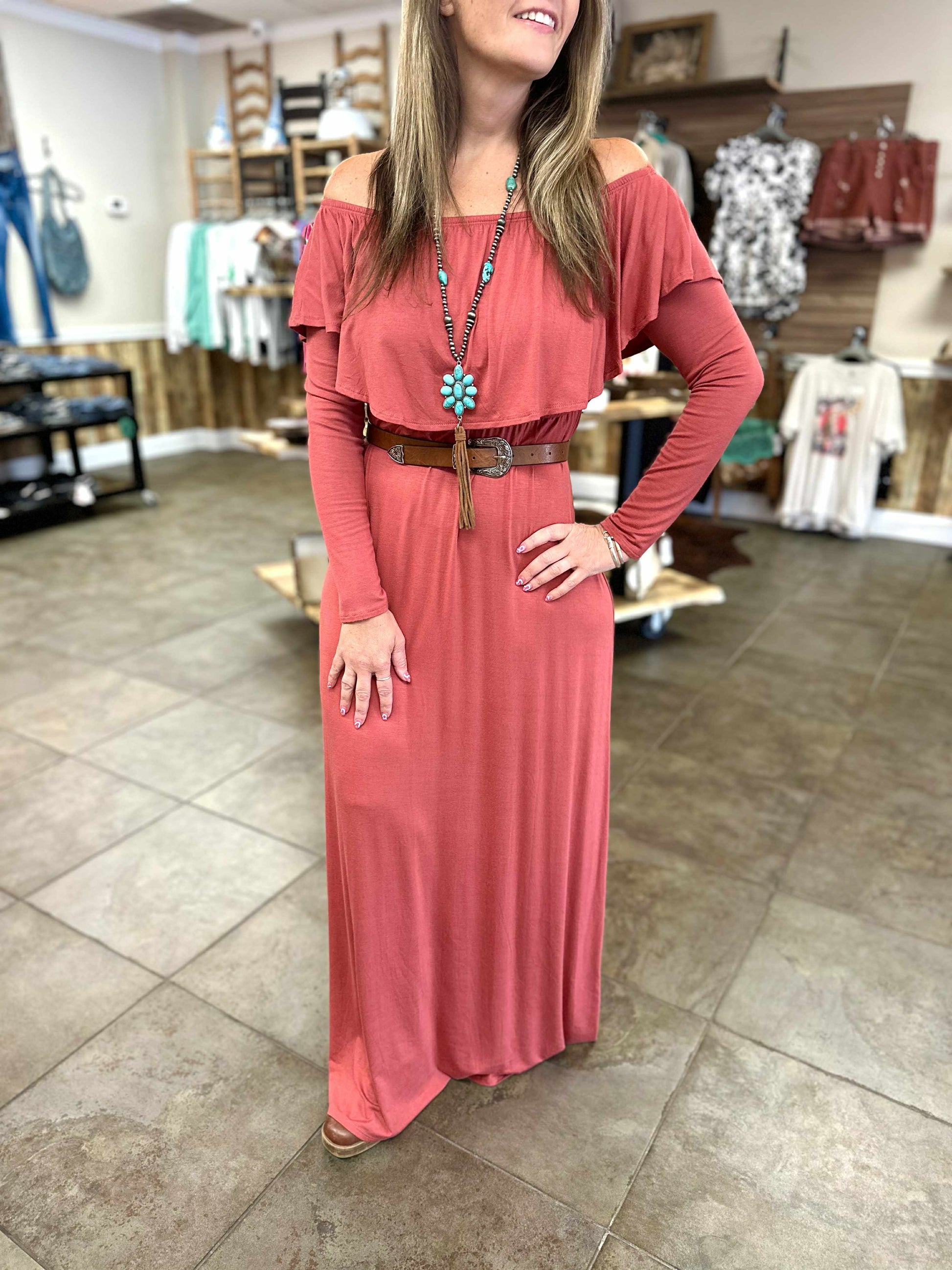 Adorable long maxi dress! I did tie up the side but its still long on me however I am 5ft! Im wearing a large and my true size. Wear it off the shoulder or on your shoulders