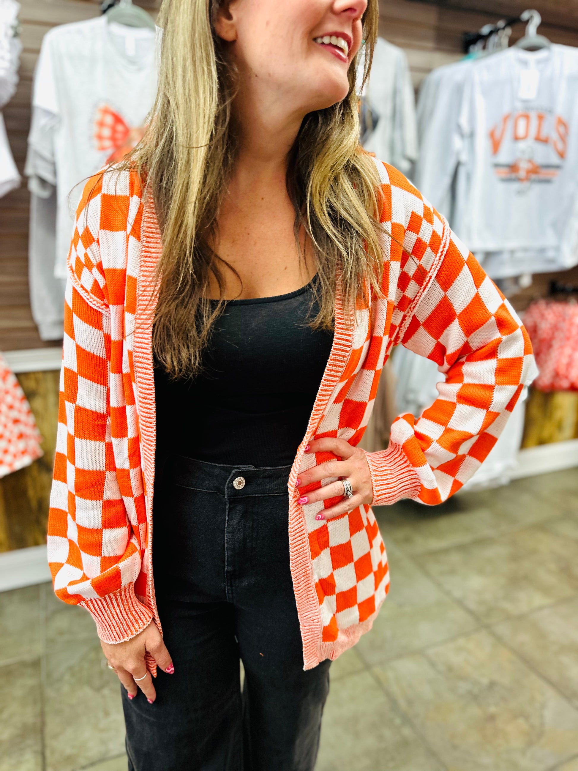 Perfect way to keep warm in the office , the couch or at the Game ! Adorable checkered cardigan and pair it with your favorite Game Day graphic !!