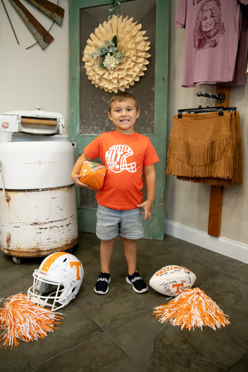 Model is wearing their true to size 5/6 . Shirt is screen printed on tee. Get your little ones ready for Game day!