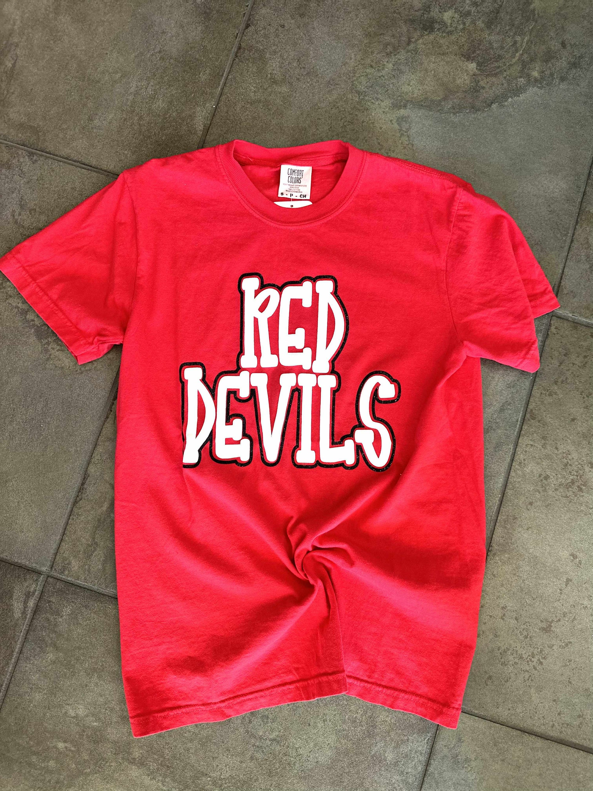 Printed on Comfort colors 100% Ring spun cotton With special touches of White puff ink and Black Glitter Outlined Red Devils