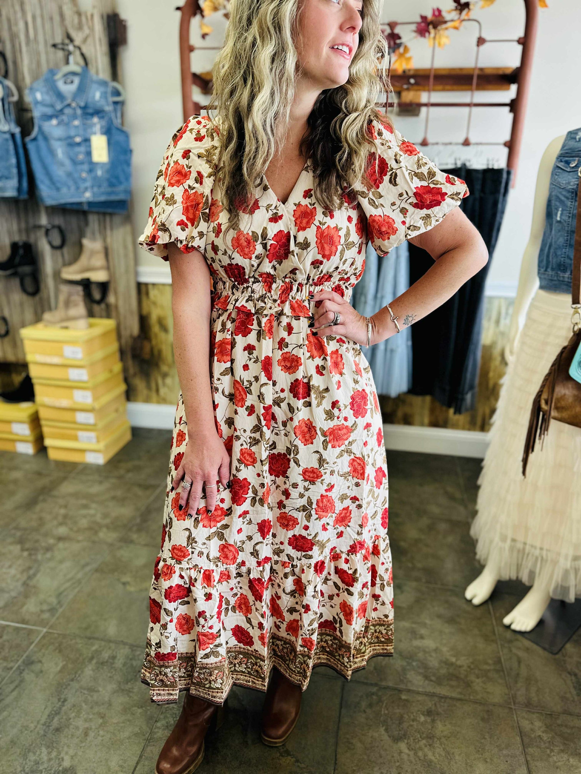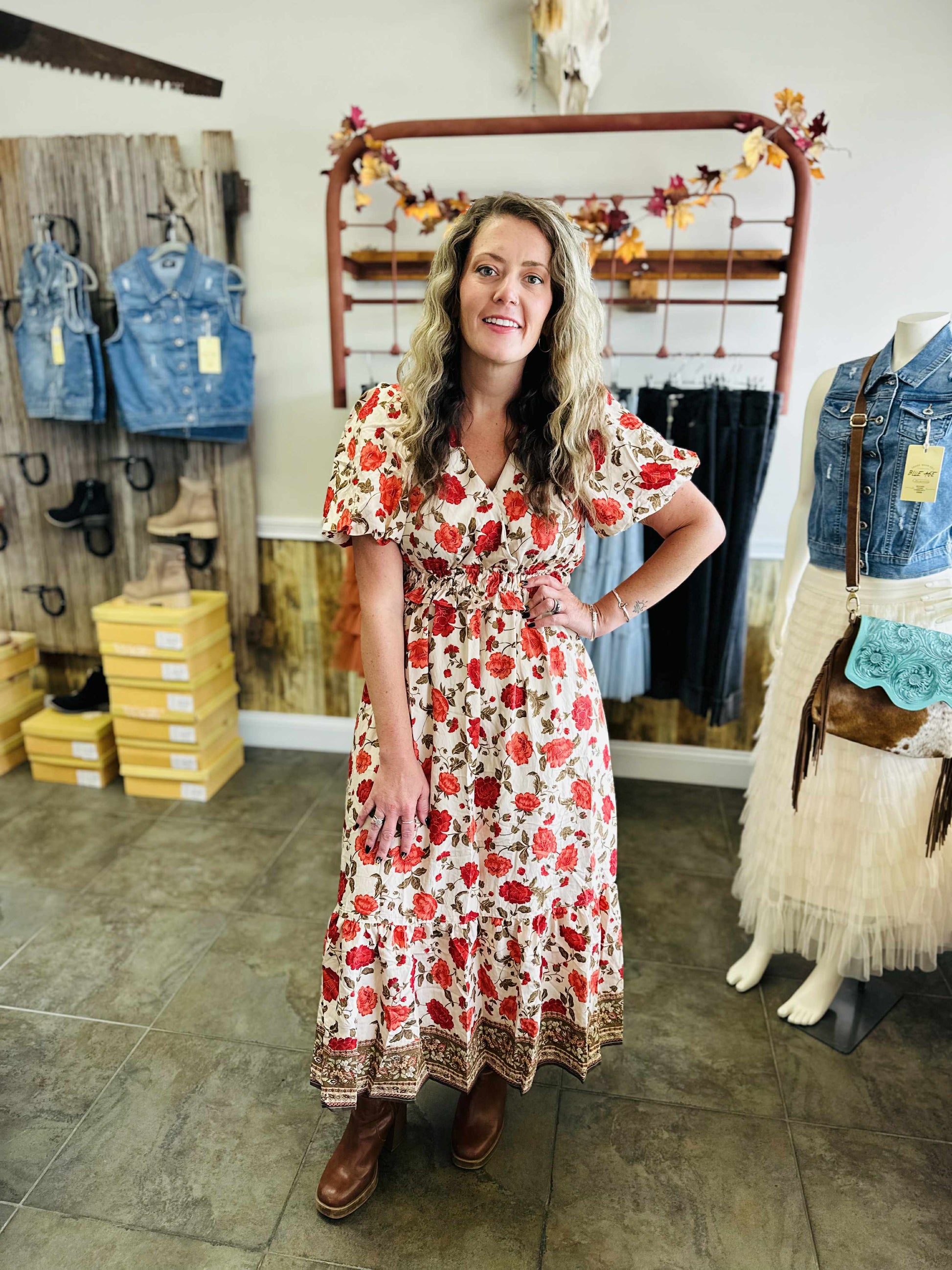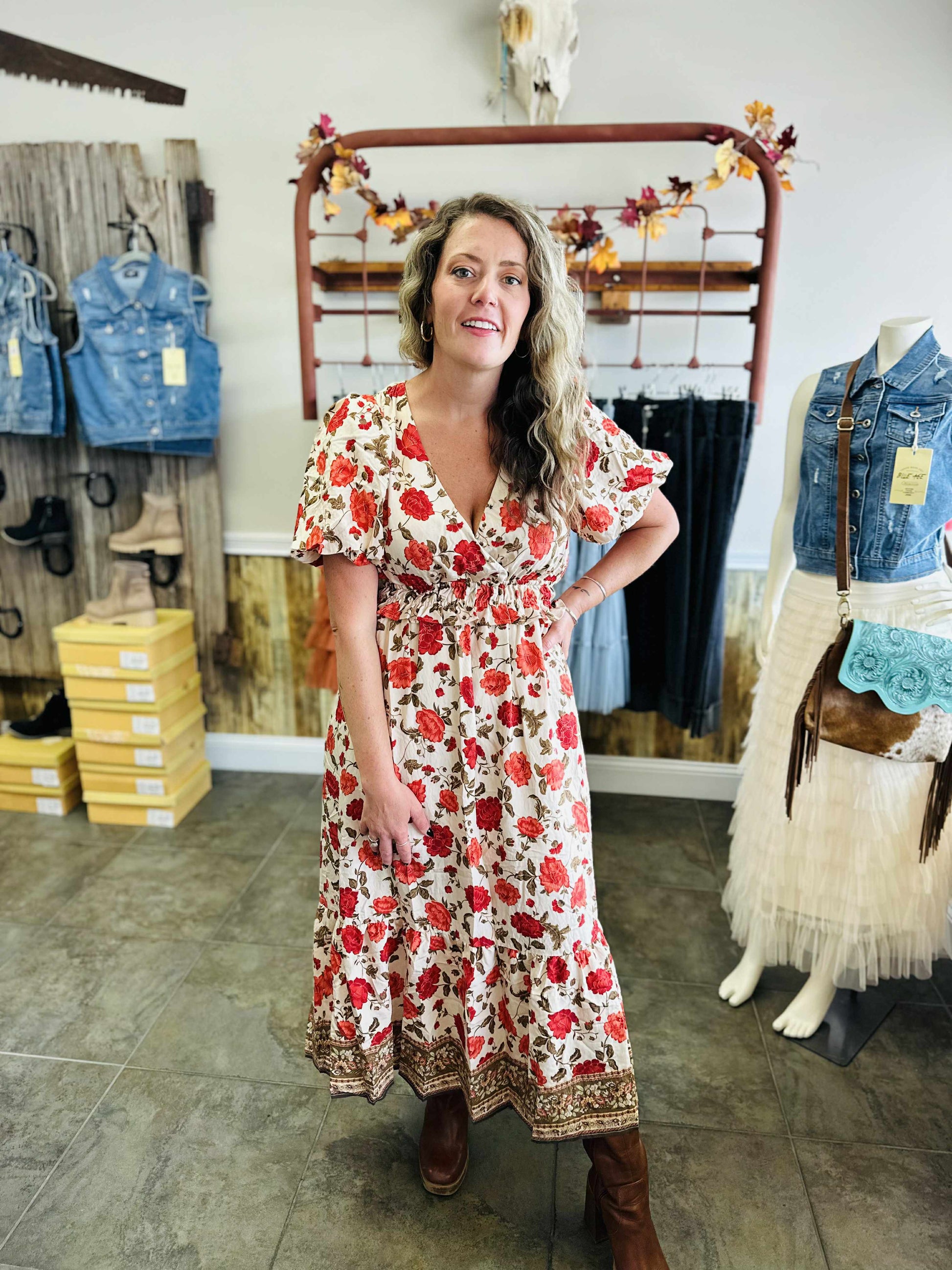 This maxi dress literally could be wore anytime of the year! Fall , Winter, Spring, Church and so much more! Does have a stretchy waistband along with additional snap in the bust area to cover up more!