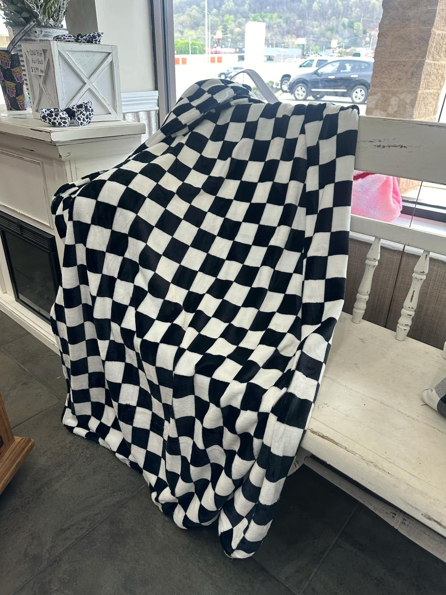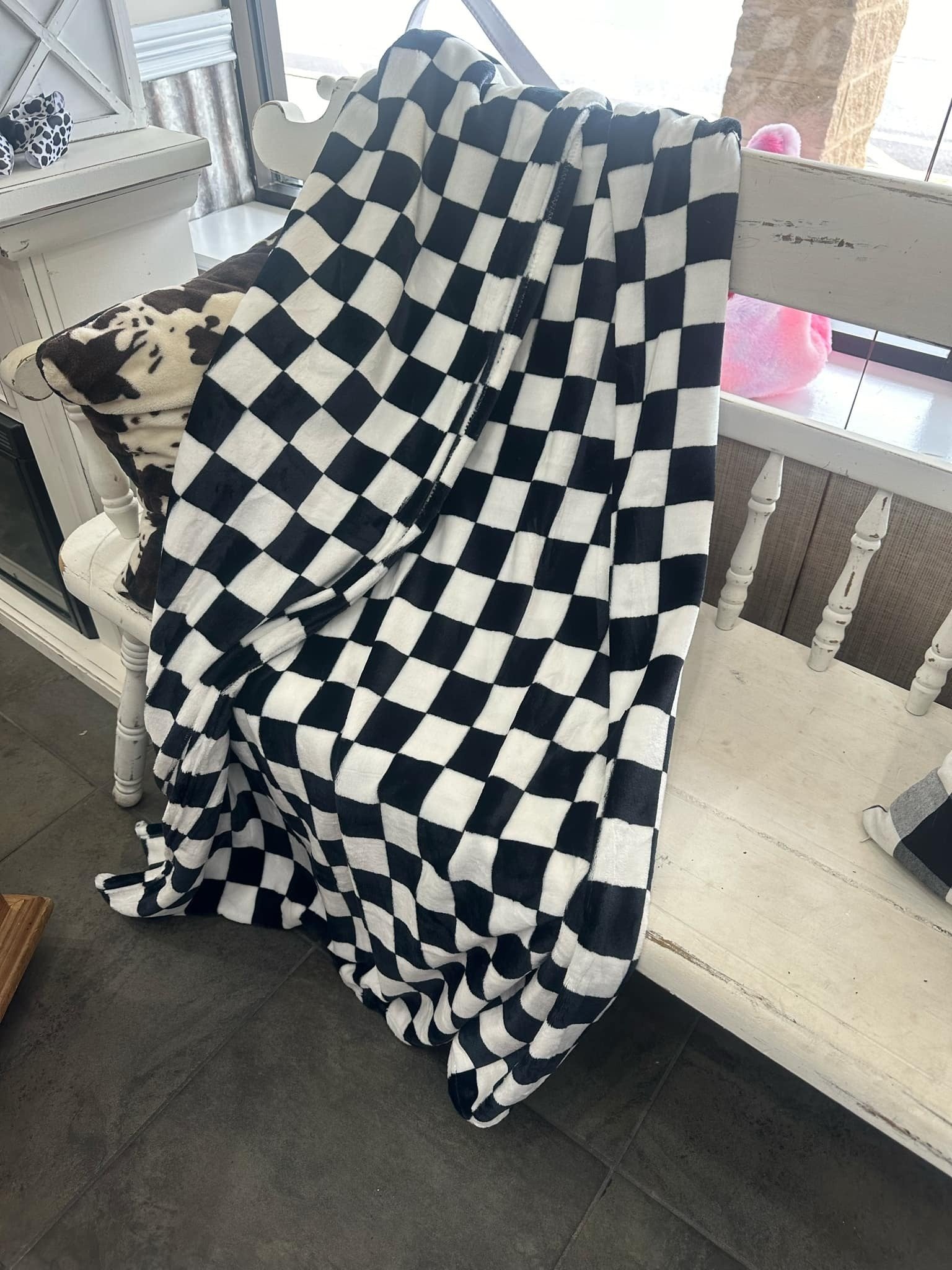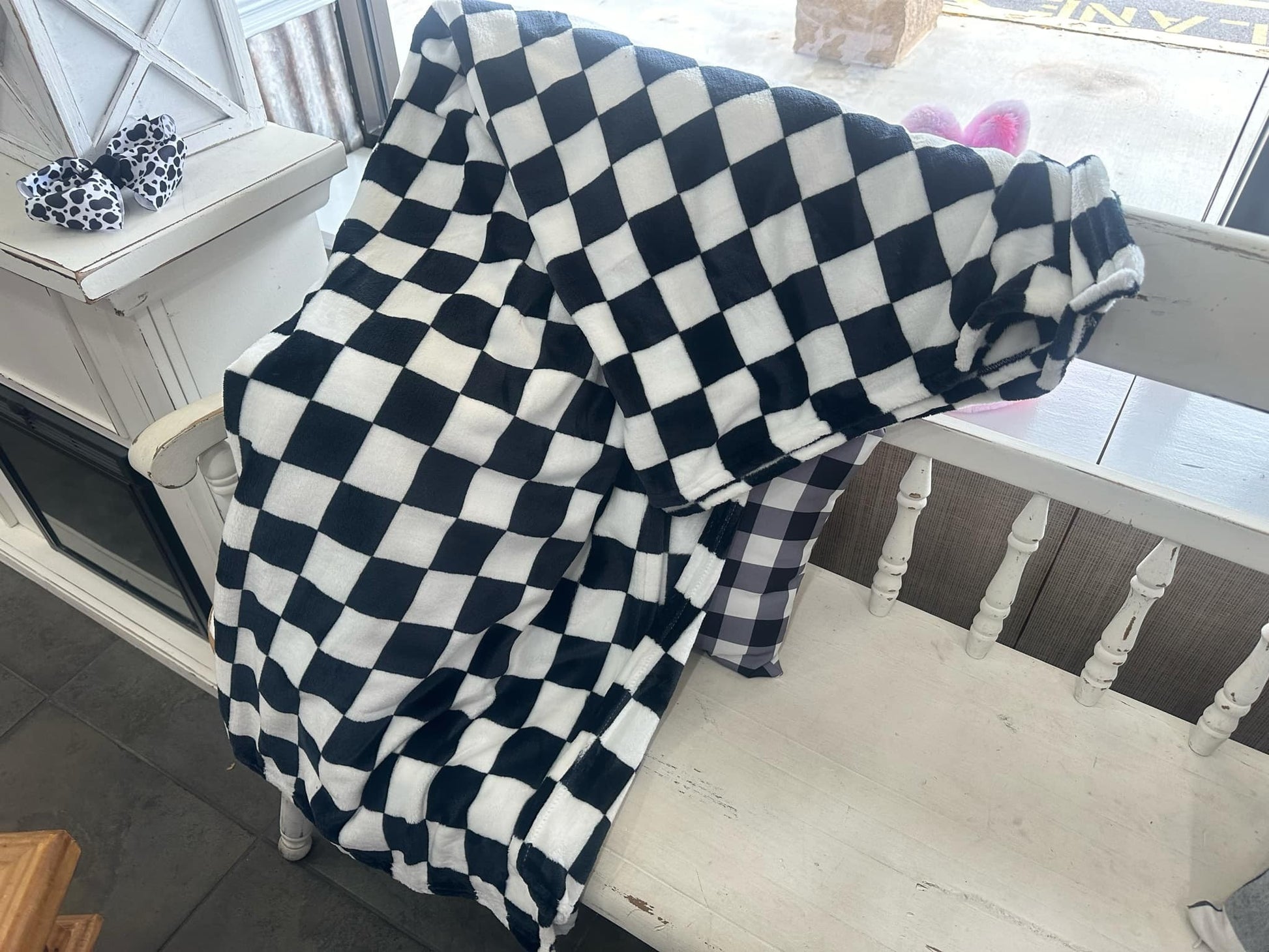 Whether its on the track on a cool summer night , or snuggled up on the couch . This soft and comfy checkered blanket will certainly keep you warm! Size of the blanket is (60x78 Inches)